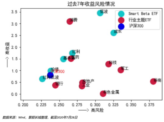 那么,Smart Beta和行业主题的ETF相比,还会具有优越性吗? 我们来看下面这张图其中横坐标代表过去一年中的风险,纵坐标代表过去一年中的收益。
