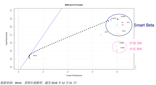 上图虚线便是马科维兹画的理论上的最好的那条线,我们可以看到Smart Beta的组合是比中证800和沪深300指数更为接近这条线的。也就是 Smart Beta比指数更接近理论上的极限(在差不多的风险时平均的收益更高)