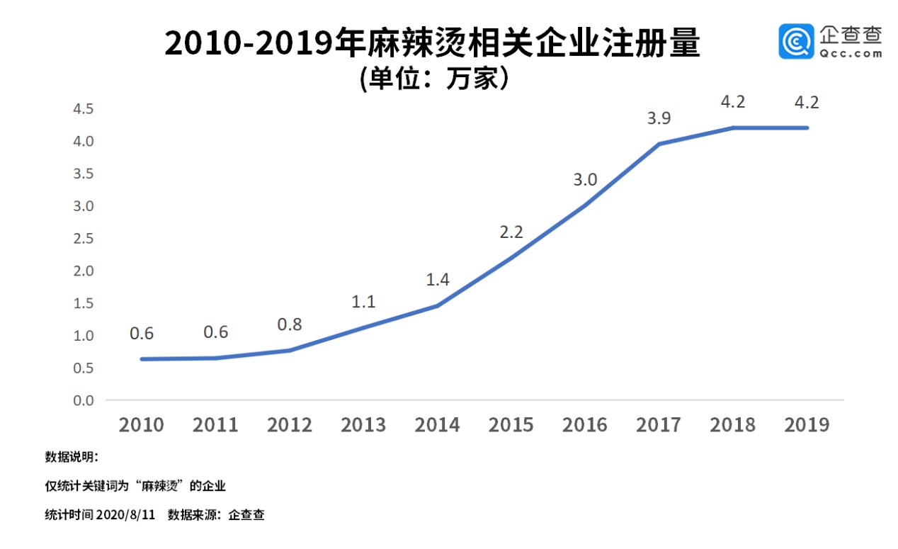 从麻辣烫相关企业的发展情况来看,过去十年企业的注册量整体呈上升趋势,2014年之后企业注册量显著增多,2017年的注册量为3.9万家,2018年和2019年的注册量同为4.2万家,是十年前注册量的7倍。