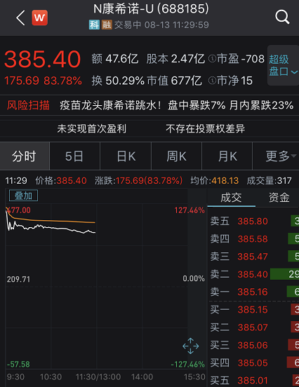 康希诺今日开盘上涨124%,截至午间收盘,涨幅收窄至83.78%,股价385.4元,总市值677亿元。以早盘成交均价计,康希诺中一签可净赚10.4万元,以最高价计,中一签可赚13万。