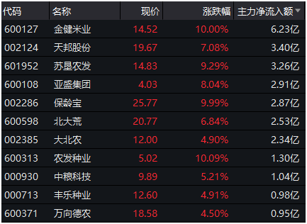 资金面上,早盘主力资金合计流入农林牧渔板块37亿元,其中,金健米业获主力资金净流入6.23亿元,居于两市首位,金健米业早盘涨停,封单金额超4.7亿元。天邦股份、苏垦农发、早盘均获3亿元以上的主力资金净流入。