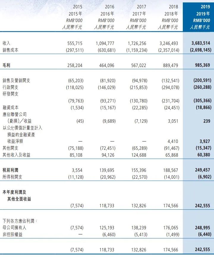 2019年年报显示,当年该公司实现净利润2.43亿元,同比增长39%;归属于母公司股东净利润为2.49亿元,同比增41.48%;经调整净利润为3.03亿元,同比增长15%;收入为36.84亿元,同比增13.50%。