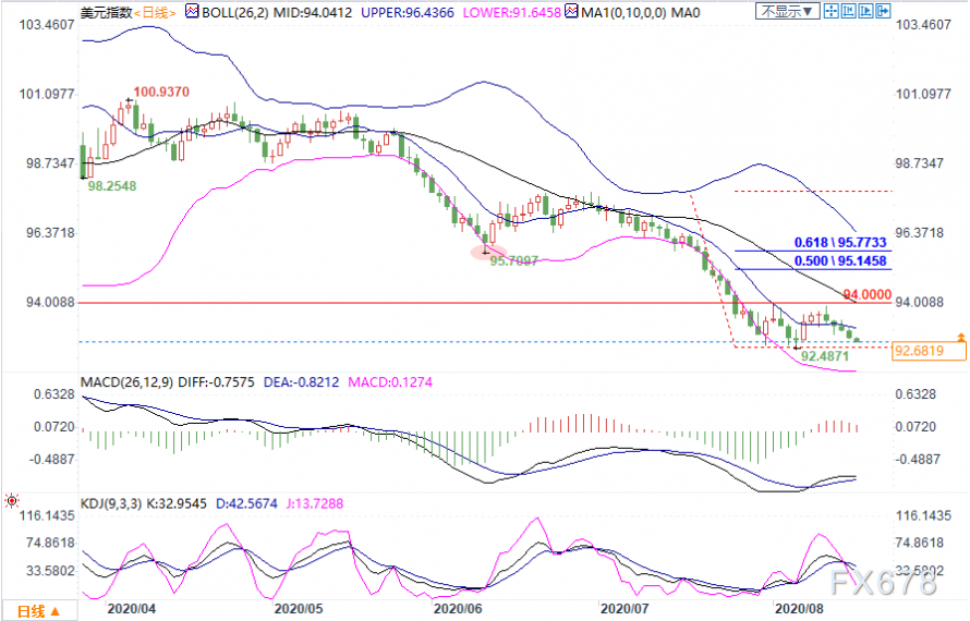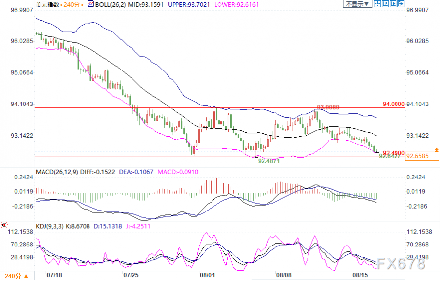 下行方面,目标位先看向8月6日低点92.49;进一步支撑在2018年5月14日低点92.24。上行阻力,先依次留意布林带中轨93.16、上轨93.70,强阻力重点关注94.00关口,这是8月3日测试的高点。