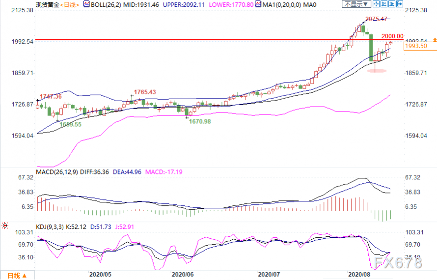 盘中延续涨势,目前逼近2000关口,因受到美元走弱、美债收益率回落的影响,提振投资者看涨黄金的情绪。由于实际利率保持在零以下,各国政府采取宽松措施来减轻疫情造成的经济损失,各大机构普遍认为黄金有望进一步攀升。