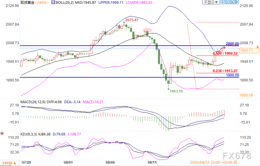 宽幅震荡;四小时级别来看,布林带开口,金价逼近上轨。MACD金叉、红柱能量增加,KDJ金叉、指数高于80。从走势来看,黄金短线偏震荡走高,留意2000关口。