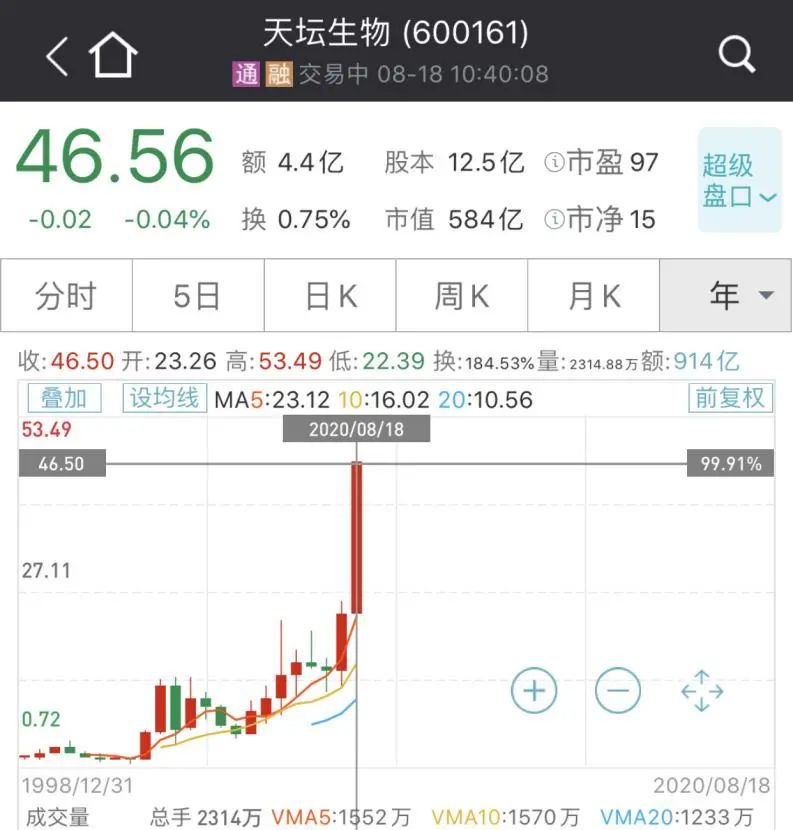 今天(8月18日)早盘,国药集团中国生物旗下的天坛生物股价一度冲高回落,截至发稿,天坛生物跌0.17%,报46.50元/股。