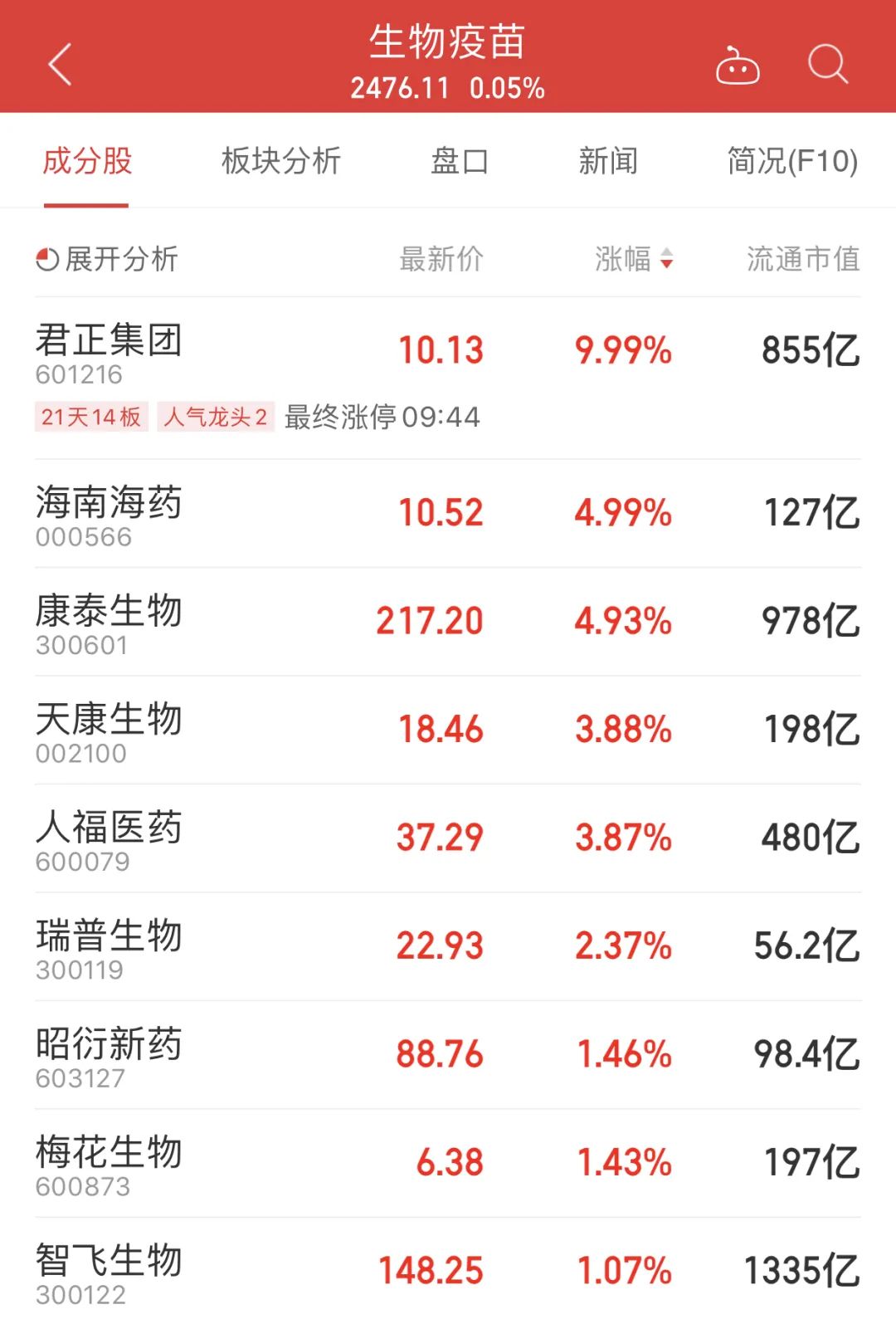 盘面上,疫苗概念股强势上涨,截至发稿,君正集团涨停,康泰生物涨4.93%、智飞生物涨1.07%、沃森生物涨0.77%。