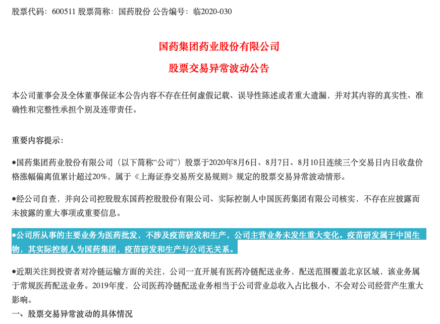 国药股份股票于2020年8月6日、8月7日、8月10日连续三个交易日内日收盘价格涨幅偏离值累计超过20%。8月11日,国药股份公告称,疫苗研发属于中国生物技术股份有限公司(以下简称“中国生物”),其实际控制人为中国医药集团有限公司(持股占比95.36%),疫苗研发和生产与公司无关系。中国生物与公司为同一实际控制人,相互之间无股权关系。