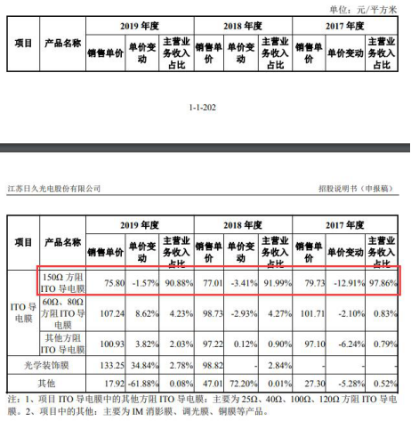 日久光电表示,报告期内公司专注于主业,主营业务占营业收入比例为98%左右。公司主营业务收入主要来自于销售ITO导电膜和光学装饰膜。150Ω方阻ITO导电膜各期销售收入占比为91%-98%。