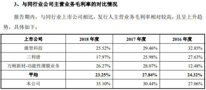 日久光电表示,总体上,除万顺新材生产少量的ITO导电膜外,上述公司的产品类别和工艺技术与发行人产品存在差异。报告期内,佛那个是主营业务毛利率呈上升趋势,主要原因为:自2016年下半年实现了IM消影膜自涂,随着自涂比例不断提升,产品单位成本下降明显;同时,随着公司业务规模的快速增长,规模化效应明显。