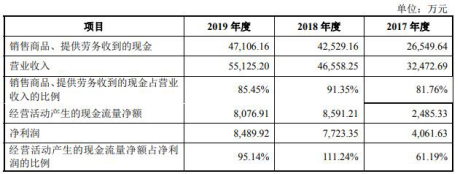 日久光电销售商品、提供劳务收到的现金均低于同期营收。2016年、2017年、2018年、2019年,日久光电实现营业收入分别为2.79亿元、3.25亿元、4.66亿元、5.51亿元;销售商品、提供劳务收到的现金分别为2.28亿元、2.65亿元、4.25亿元、4.71亿元。