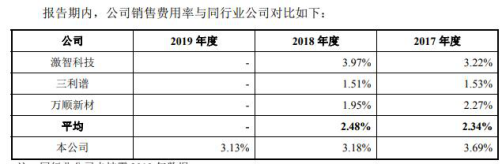 2016年、2017年、2018年、2019年,日久光电销售费用率分别为3.44%、3.69%、3.18%、3.13%。2016年、2017年、2018年,同行业可比公司销售费用率平均值分别为2.64%、2.34%、2.48%。