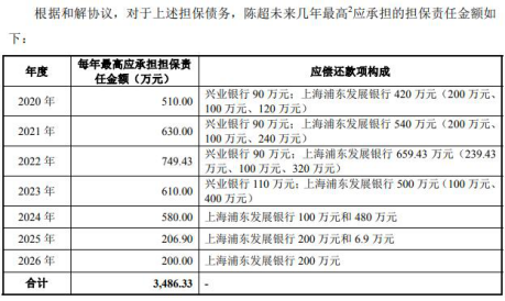 根据和解协议,对于上述担保债务,陈超未来几年最高应承担的担保责任金额合计3486.33万元。