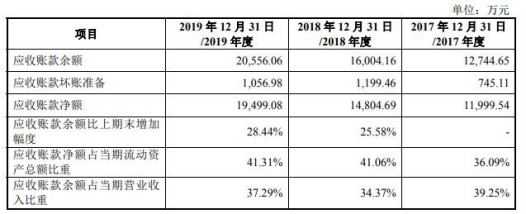 2016年末、2017年末、2018年末、2019年末,日久光电应收账款余额分别为7881.15万元、1.27亿元、1.60亿元、2.06亿元,2017年末增长率为61.71%,2018年末增长率为25.58%,2019年末增长率为28.44%。