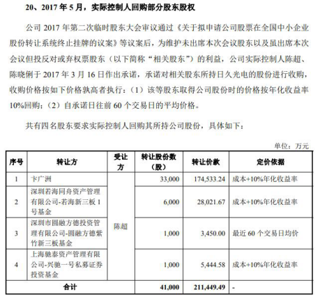根据已有资料看来,日久光电在2016年6月30日前顺利在新三板挂牌,理论上应该是“赌”赢了,但根据此次招股书中却披露:“公司2017年第二次临时股东大会审议通过《关于拟申请公司股票在全国中小企业股份转让系统终止挂牌的议案》等议案后,为维护未出席本次会议股东以及虽出席本次会议但投反对或弃权票股东(以下简称“相关股东“)的利益,公司实际控制人陈超、陈晓俐于2017年3月16 日作出承诺,承诺对相关股东所持日久光电的股份进行收购,收购价格按如下价格孰高者执行:(1)该等股东取得公司股份时的价格按年化收益率10%回购; (2)自承诺日往前60个交易日的平均价格。”