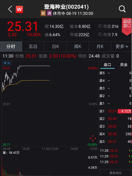 8月19日上午,种业概念股龙头登海种业早盘再度强势封板。数据显示,月内,登海种业股价已经暴涨超60%以上。