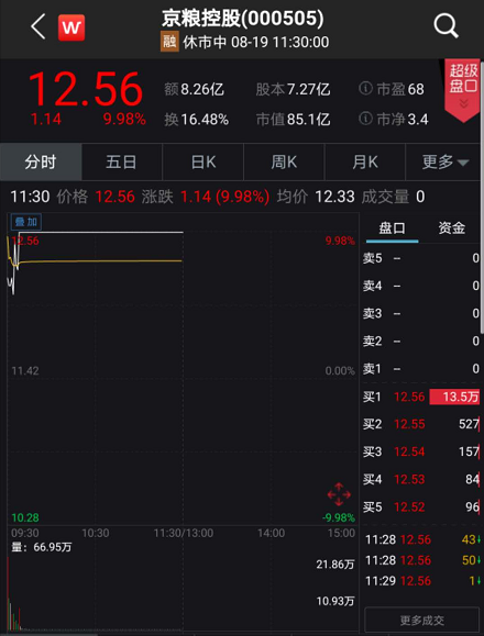 8月19日,人造肉概念股京粮控股开盘直接涨停。截至午盘,京粮控股报收12.56元,换手率高达16%。