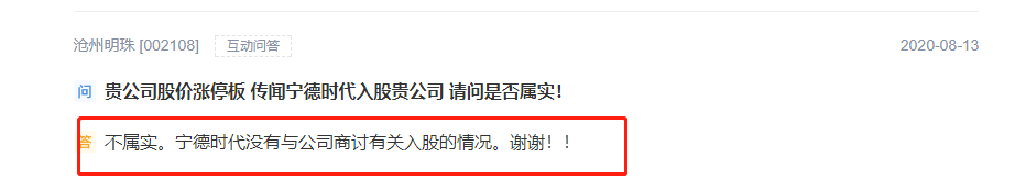 不过在股价涨停后,8月13日开盘前,沧州明珠在互动平台上回复投资者称宁德时代入股公司的传闻不属实:“宁德时代没有与公司商讨有关入股的情况。”