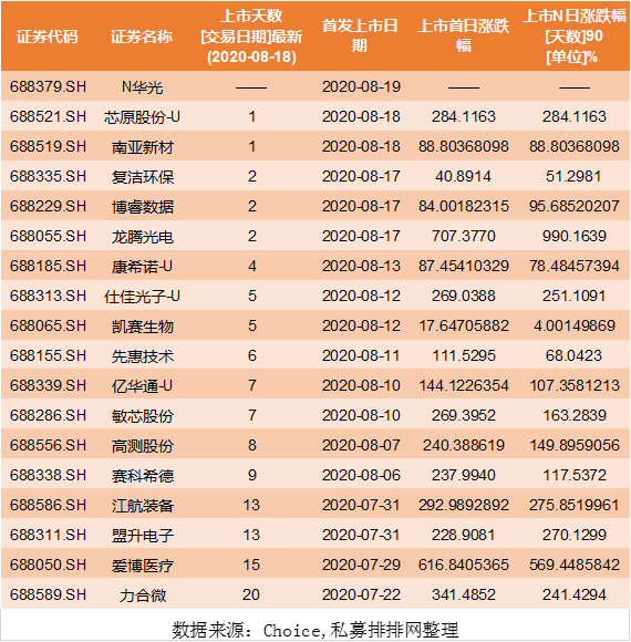 截至2020年8月18日,在科创板开市的这262天,共计156家公司在科创板上市,除了建龙微纳一只新股破发,剩余155只科创板公司首日均迎来开门红。首日涨逾100%的个股达到了102只,占比65.38%。其中,国盾量子7月9日923%的首日涨幅一度引发市场热议。8月17日,国资控股企业龙腾光电首日上涨707.38%,创了科创板首日涨幅第二的记录。