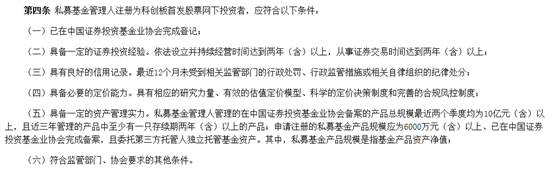 根据中国证券业协会公布的《科创板首次公开发行股票网下投资者管理细则》,私募基金管理人注册为科创板首次公开发行股票网下投资者,除了需要持续经营时间与从事证券交易的时间在2年以上,还需要具备一定的资产管理实力。也就是说,备案产品总规模最近两个季度均为10亿(含)以上,且近三年管理的产品中至少有一只存续期两年(含)以上的产品;申请注册的私募基金产品规模应为6000万元以上。根据上述条件进行逐一筛选后,记者发现符合此要求的私募基金管理人并没有想象中的那么多。