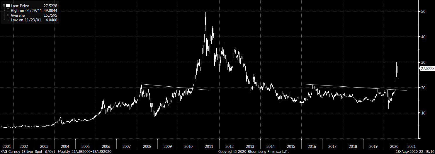 现货白银价格本月早些时候站上了29美元,这是7年以来的最高水平。白银价格此后尽管有所回落,但仍维持在27美元/盎司的水平。自7月中旬全面上涨以来,白银价格已经上涨了近39%。尽管目前的基本面缓解依然对金银有利,但随着价格高涨,风险回报已经有所恶化。