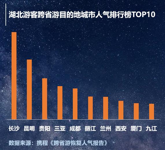 从7月17日湖北省恢复跨省旅游以来,湖北人外出旅游的热情也迅速升温。从携程平台的跟团游、自由行等产品看,湖北人跨省游,目的地省份人气排名的前十名是:湖南、云南、贵州、江西、海南、甘肃、四川、青海、广西、山西,湖北人最喜爱去这些目的地游玩。从目的地城市角度来看,长沙、昆明、贵阳、三亚、成都、丽江、兰州、西安、厦门、九江这十个目的地城市的人气最高,是湖北游客的心头好。
