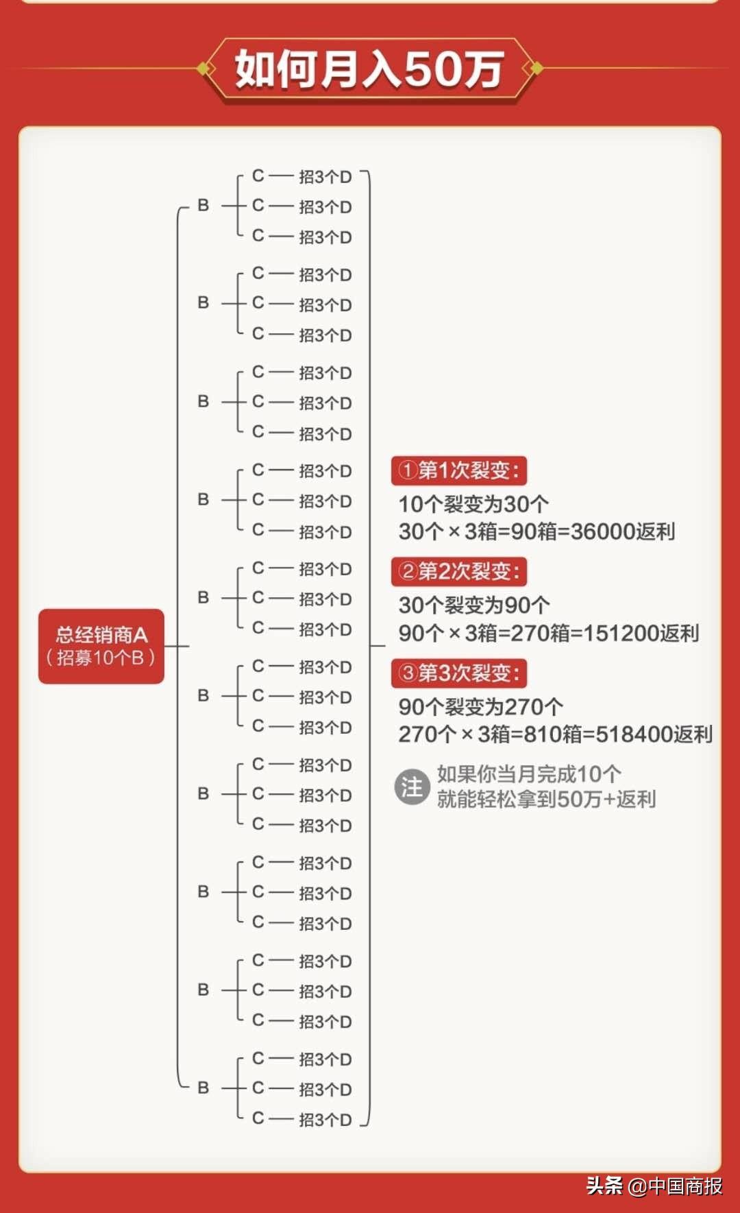 举例来说,如先交纳9120元成为总经销商,只需要发展三个总经销商,这三个总经销商分别再各自发展三个,以此类推。当个人团队中出现十个9120元级别的总经销商时,代理人即可升级为县级代理,出现30个9120元级别的总经销商时则可升级为市级代理,出现300个9120元级别的总经销商时,可升级为省级代理。这一模式被为3×3裂变。