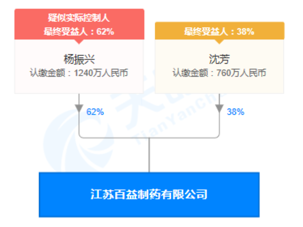 天眼查显示,江苏百益制药有限公司成立于2005年3月9日,注册资本为2000万元。杨振兴是持股62%的大股东,同时也是法定代表人、董事长兼总经理;沈芳是持股38%的二股东。