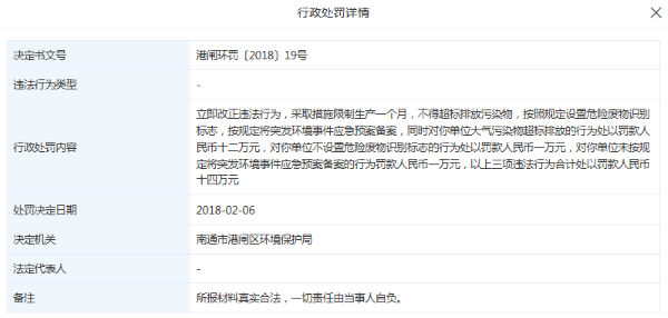 值得注意的是,天眼查显示,2018年2月6日,江苏百益制药有限公司因大气污染物超标排放、不设置危险废物识别标志、未按规定将突发环境事件应急预案备案,被南通市港闸区环境保护局处罚款14万元。