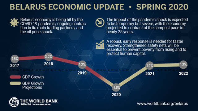 世界银行在今年春季发布的《白俄罗斯经济最新动态报告》显示,作为一个小型、开放的、依赖商品出口的经济体,白俄罗斯深受主要贸易伙伴经济衰退、油价暴跌以及疫情导致的全球金融动荡所造成的冲击。世行预计,白俄