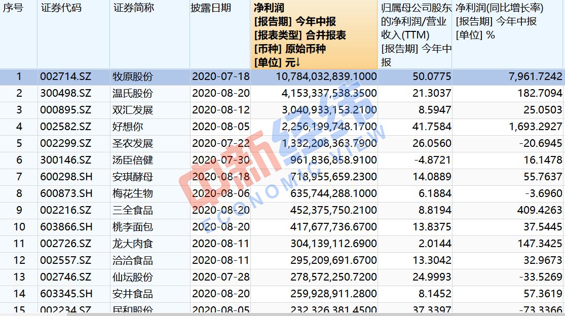 牧原股份、温氏股份以及双汇发展一直都是养猪概念股中的龙头企业。财报显示,今年上半年,牧原股份实现营收210.33亿元,获净利107.84亿元,同比增长7961.7%,也是目前业绩增长最快的食品企业。
