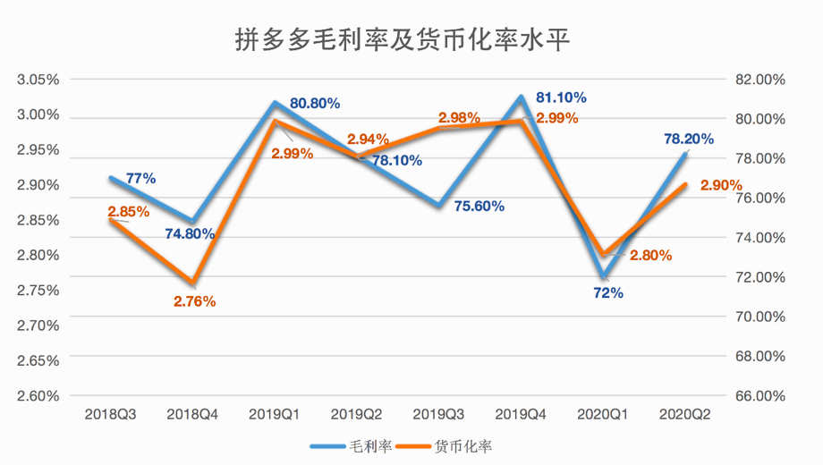 从“赚钱”的角度看,拼多多本季的货币化率增加了1%,依旧维持在3%左右的低水平,未来增长空间巨大。拼多多2020年第二季度的毛利润为95.31亿元,毛利率达到78%,比一季度的72%提升了6个百分点,增长幅度更明显。