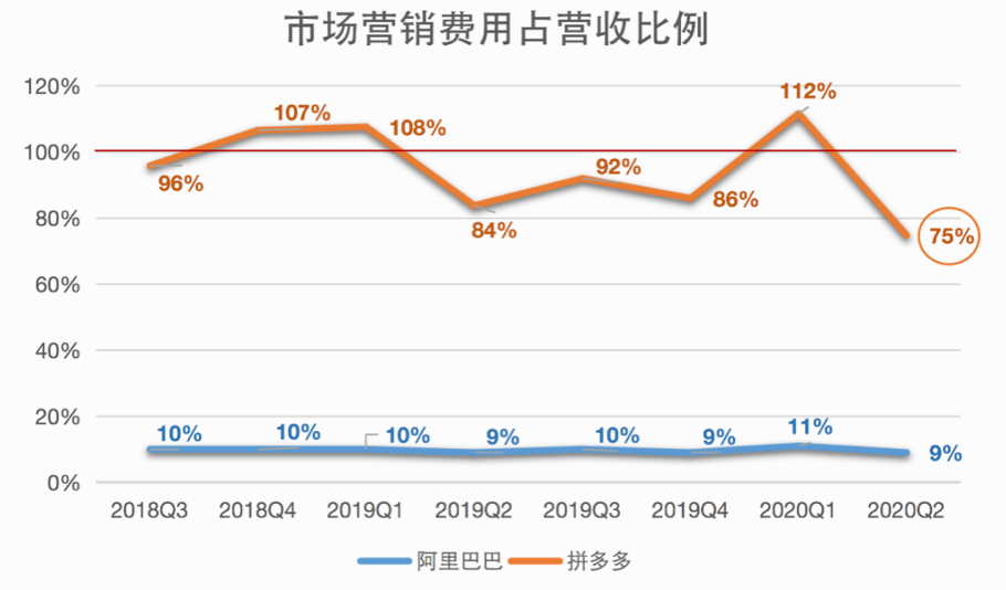 与ARPU下降对应的是,拼多多也刻意降低了在营销上的投入。