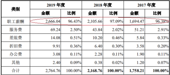 2015至2019年,盈建科研发投入中,职工薪酬分别为1002.32万元、1275.70万元、1694.47万元、2105.66万元、2666.04万元;占比分别为86.31%、96.63%、96.38%、97.09%、96.43%。