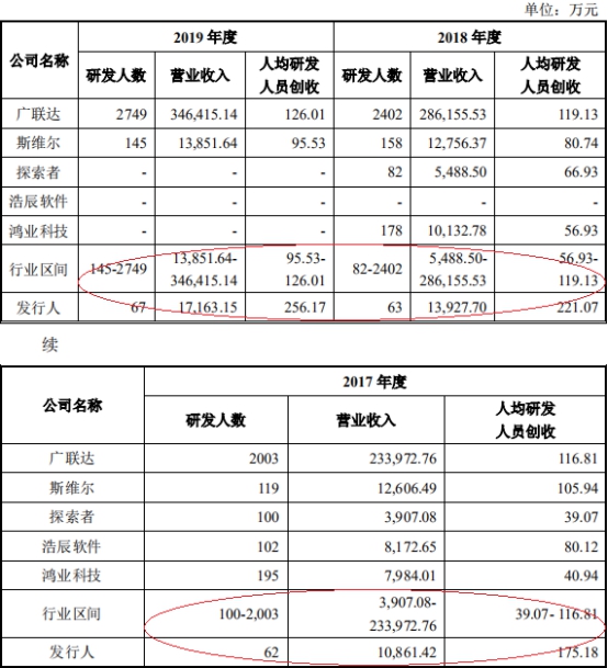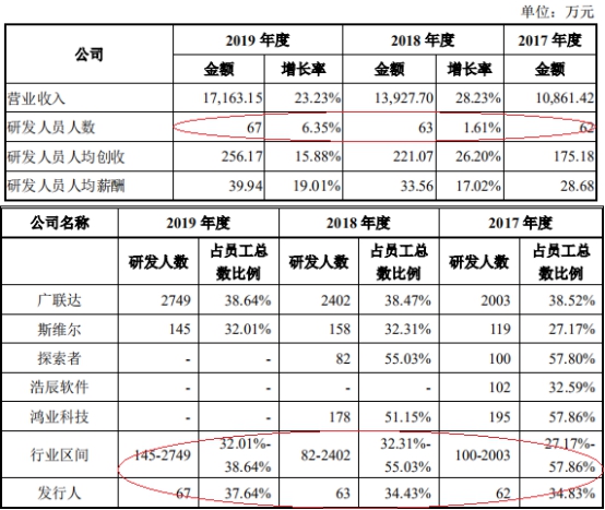 盈建科主营业务为建筑结构设计软件的开发、销售及相关技术服务。2016年至2019年,研发人员人数分别为53人、62人、63人、67人;行业区间分别为79-1691人、100-2003人、82-2402人、145-2749人。