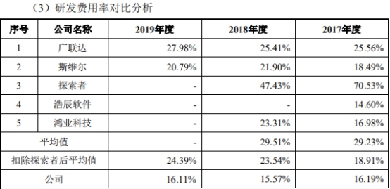 2015年至2019年,盈建科同行业可比公司研发费用率均值分别为26.71%、28.42%、18.91%、23.54%、24.39%。