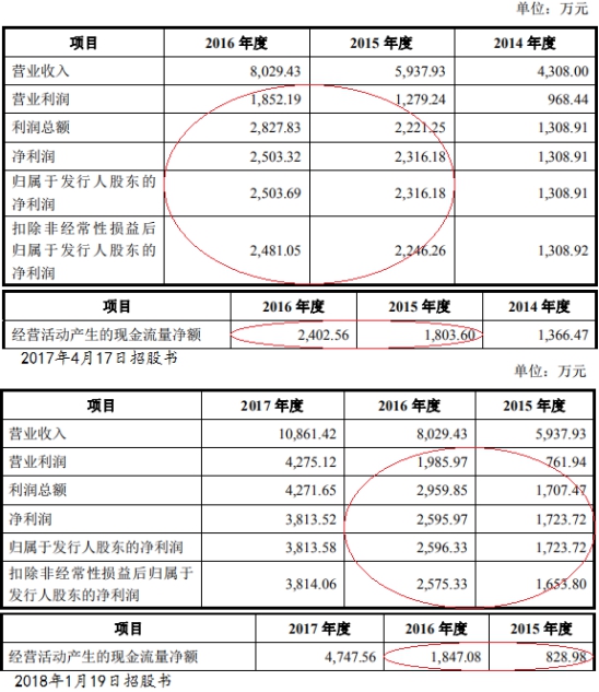 2015年、2016年净利润:2017年4月17日招股书分别为2316.18万元、2503.32万元;2018年1月19日招股书分别为1723.72万元、2595.97万元;分别相差592.46万元、92.65万元;
