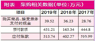 与此同时,在其2019年的现金流量表中,公司“购买商品、接受劳务支付的现金”也非常少,仅为39.52万元,而2019年的预付款项为451.21万元,比2018年新增了285.87万元,若剔除当年预付款项新增的285.87万元影响,则2019年与采购相关的现金支出就变成了-246.35万元,现金支出为何变为负数,如此的情况是令人不解的。