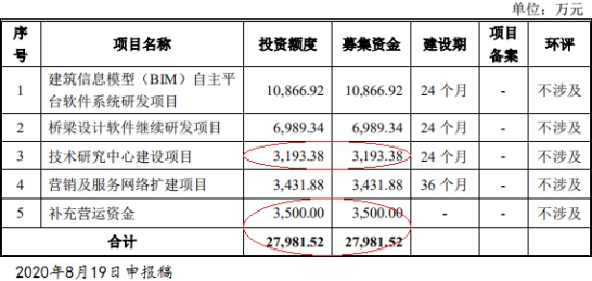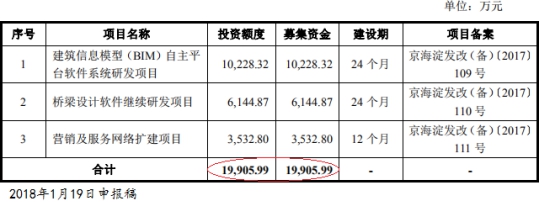 1.建筑信息模型(BIM)自主平台软件系统研发项目,投资额度1.09亿元,募集资金1.09亿元;2.桥梁设计软件继续研发项目,投资额度6989.34万元,募集资金6989.34万元;3.技术研究中心建设项目,投资额度3193.38万元,募集资金3193.38万元;4.营销及服务网络扩建项目,投资额度3431.88万元,募集资金3431.88万元;5.补充营运资金,投资额度3500.00万元,募集资金3500.00万元。