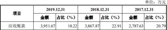 2014年至2019年,盈建科应收账款账面价值分别为378.71万元、1669.76万元、3014.85万元、2787.63万元、3867.87万元、3951.67万元;占流动资产的比例分别为18.31%、29.71%、29.98%、20.79%、22.91%、18.22%。