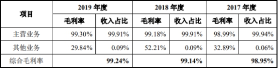 2014年至2019年,盈建科综合毛利率分别为93.96%、99.00%、98.71%、98.95%、99.14%、99.24%;其中,主营业务毛利率分别为93.96%、99.00%、98.76%、98.99%、99.18%、99.30%。