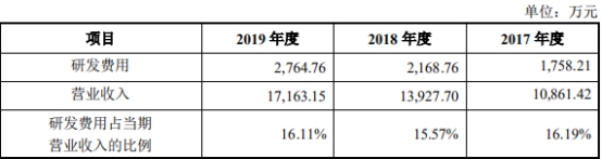 2014年至2019年,盈建科研发投入分别为835.45万元、1161.38万元、1320.16万元、1758.21万元、2168.76万元、2764.76万元;占当期营业收入的比例分别为19.39%、19.56%、16.44%、16.19%、15.57%、16.11%。