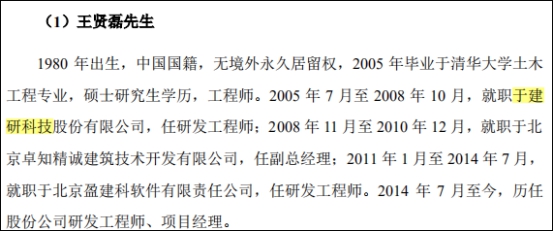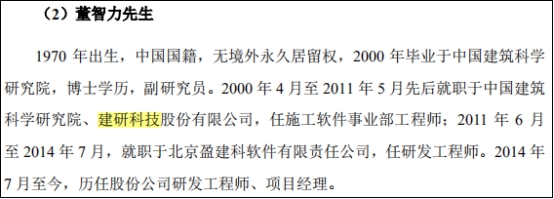 公司核心人员中,王贤磊曾任建研科技研发工程师;董智力曾任建研科技施工软件事业部工程师。王贤磊2014年7月至今,历任盈建科研发工程师、项目经理;董智力2014年7月至今,历任盈建科研发工程师、项目经理。