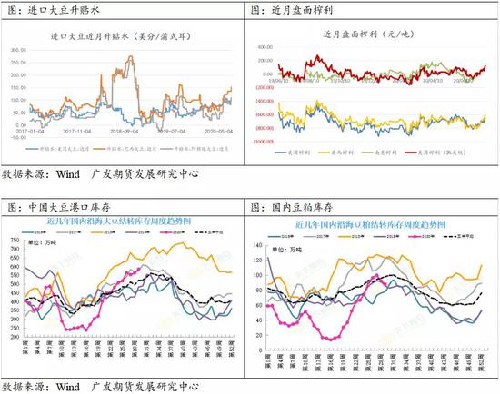 国内大豆及豆粕库存继续回升,尽管到港巨大,但下游需求较好,油厂库存压力有限。截止2020年第30周(截止7月24日当周),国内沿海主要地区油厂进口大豆总库存量573.81万吨,较去年同期490.04万吨增加17.09%;豆粕总库存量87.51万吨,较去年同期82.66万吨增加5.86%;豆粕未执行合同量408.11万吨,较去年同期的295.21万吨,增加38.24%。尽管数量在较高位置,但近期豆粕库存整体呈下滑趋势,油厂并未出现胀库压力,且八月之后大豆供应将逐渐下滑,美豆的采购将会变得愈发关键。