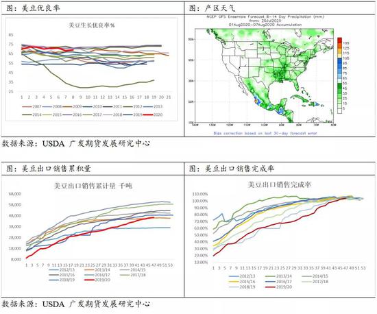 美豆整体生长情况较好,目前来看天气炒作的概率正在不断降低。美国农业部在每周作物生长报告中公布称,截至2020年7月26日当周,美国大豆优良率为72%,市场预期为69%,去年同期为54%。美国大豆开花率为76%,去年同期为52%,五年均值为72%。美国大豆结荚率为43%,去年同期为17%,五年均值为36%。