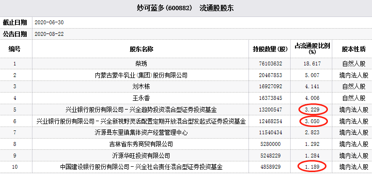 妙可蓝多今年中报显示,兴全基金公司旗下的兴全趋势投资、兴全新视野灵活配置、兴全社会责任均为前十大流通股东,分别持股1320.05万股、1246.83万股、485.89万股,占其流通股比例的3.23%、3.05%、1.19%。其中,兴全社会责任为今年二季度新进。