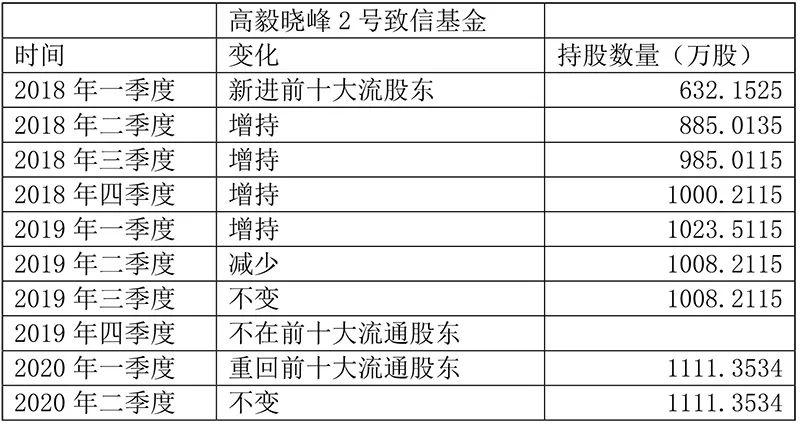 邓晓峰管理的两只产品持股数量变化或不大,截至去年三季度末,高毅晓峰2号致信基金仍持有宏发股份1008万股,但是去年年底不在前十大流通股东,今年一季度末重回前十大流通股东,持有1111万股。中信信托锐进43期高毅晓峰投资集合资金信托计划去年年底仍持有1000多万股。