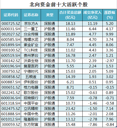 前十大活跃个股方面,京东方A、三一重工、分众传媒、海螺水泥、紫金矿业北向资金净买入金额居前,净买入金额分别为11.19亿元、6.44亿元、4.77亿元、4.7亿元、4.45亿元;东方财富、隆基股份、中国中免、立讯精密、中国平安北向资金净卖出较多,净卖出金额分别为7.86亿元、2.78亿元、2.01亿元、1.5亿元、1.46亿元。