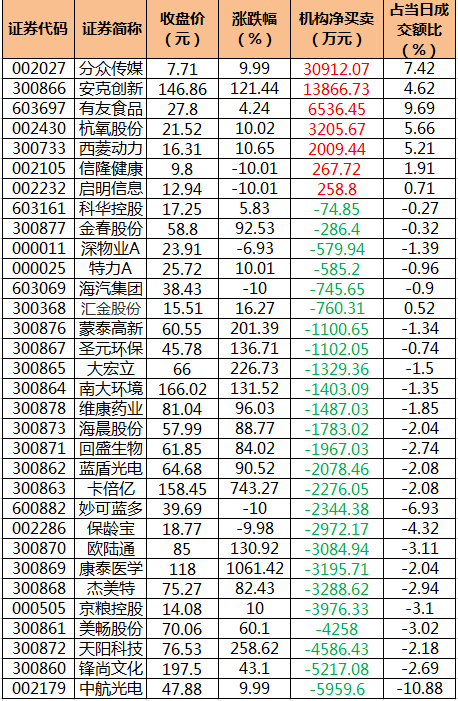 盘后龙虎榜数据显示,机构席位资金净买入614.53万元,其中,净买入的个股7只,净卖出的个股25只。机构净买入最多的股票是分众传媒,净买入金额为30912.07万元;机构净卖出最多的股票是中航光电,净卖出金额为5959.6万元。