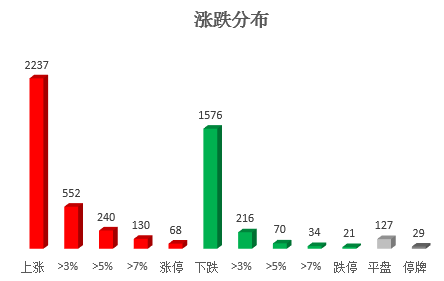 截至收盘,沪深两市合计2237只个股上涨,1576只个股下跌。包括ST股在内,共有68只个股涨停,21只个股跌停。